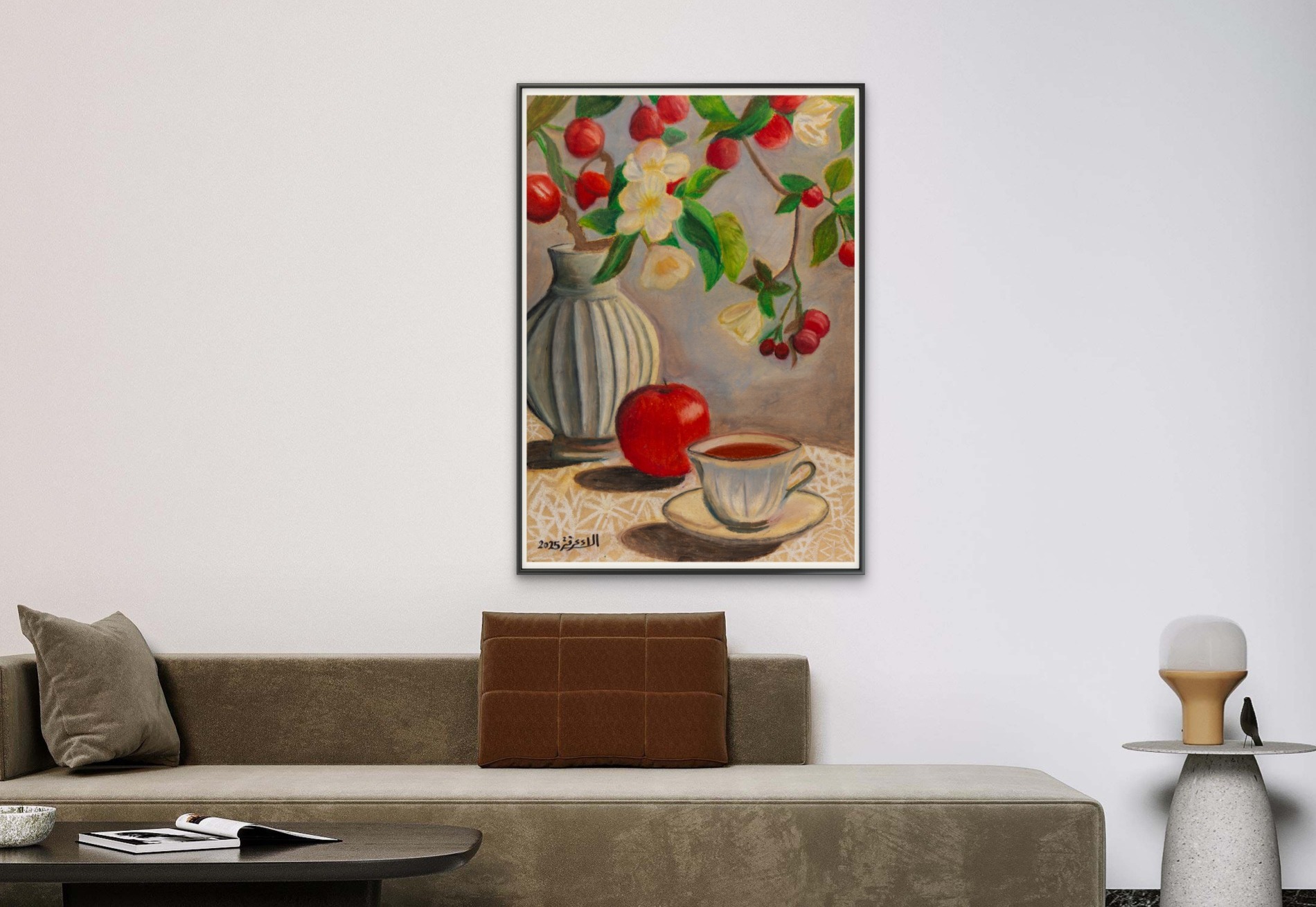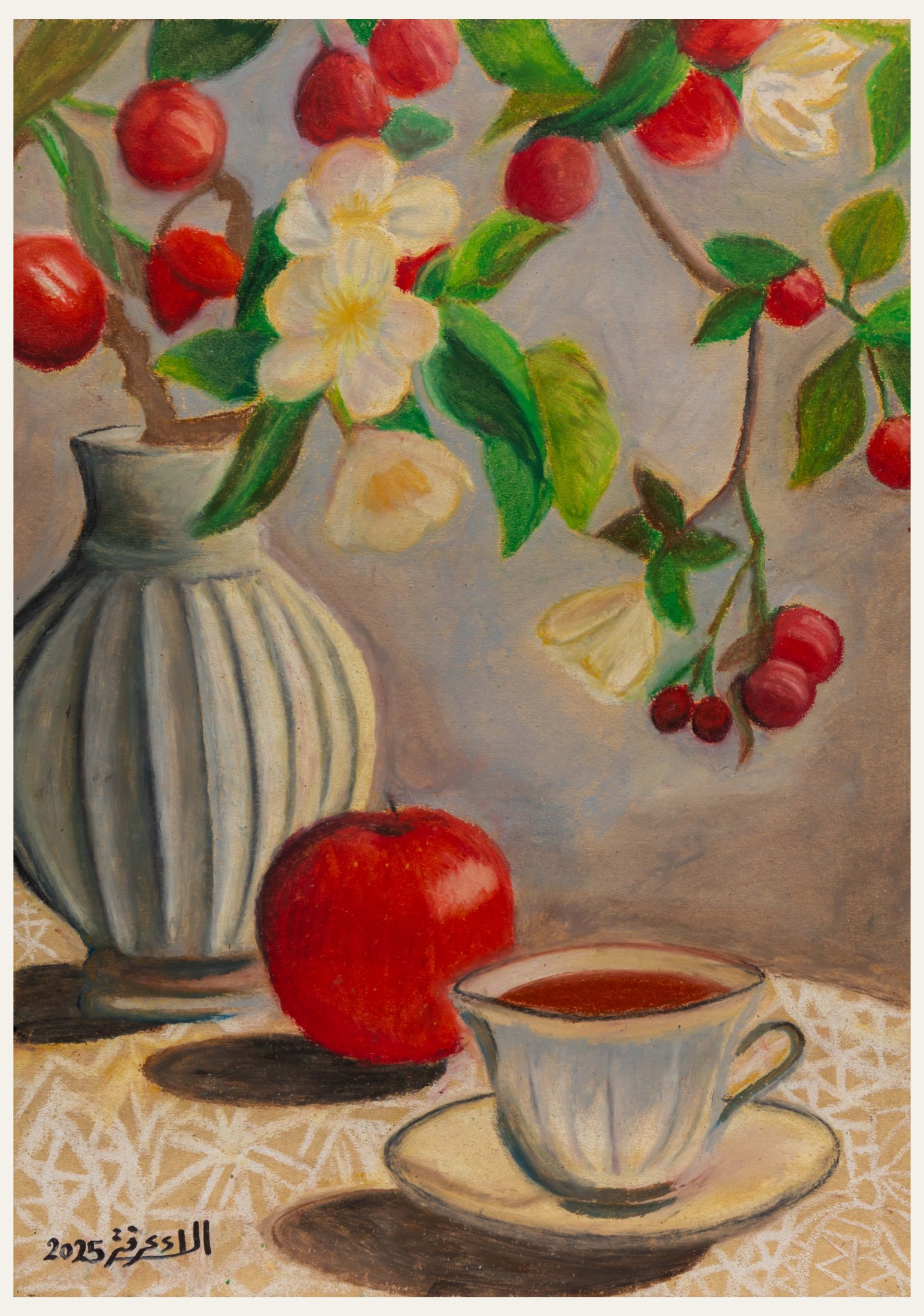 “A Morning” by Alaa Arfa presents a calm domestic scene built around simple forms and balanced color. A vase of blossoms and fruit rests beside tea, creating a composition centered on warmth, nourishment, and daily rhythm. The soft palette and natural arrangement evoke the intimacy of a quiet morning interior.