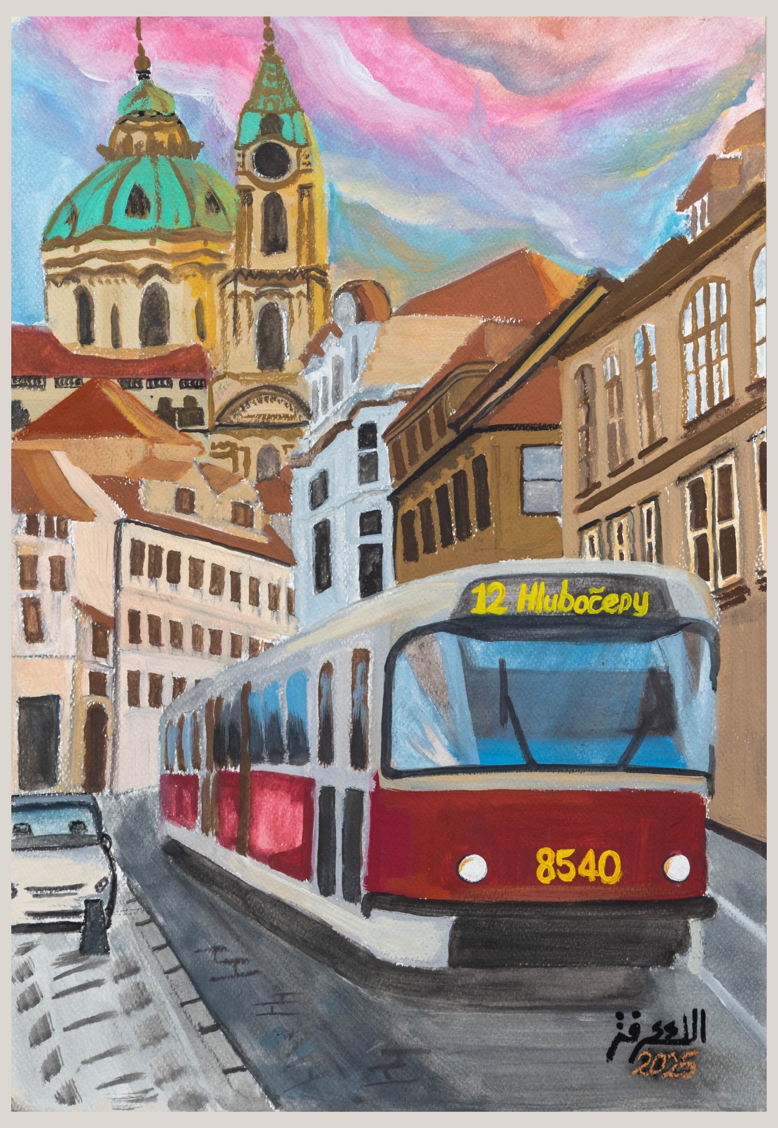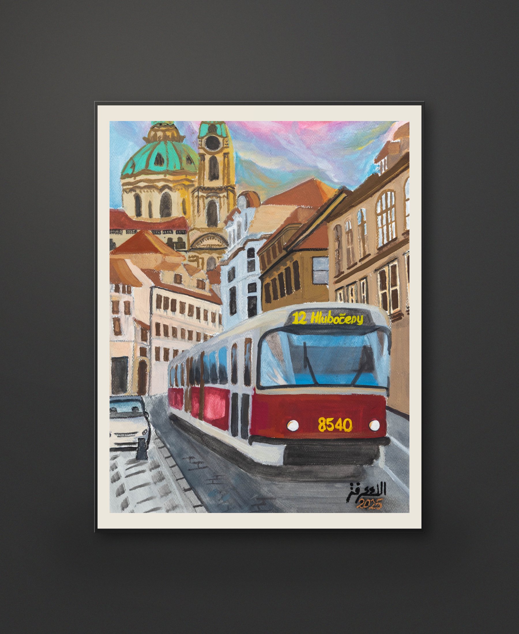 This Prague streetscape by Alaa Arfa blends architectural structure with painterly color and motion. The composition draws the viewer forward through the city corridor toward the cathedral skyline, while the passing tram anchors the scene in everyday European rhythm.